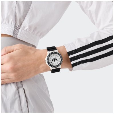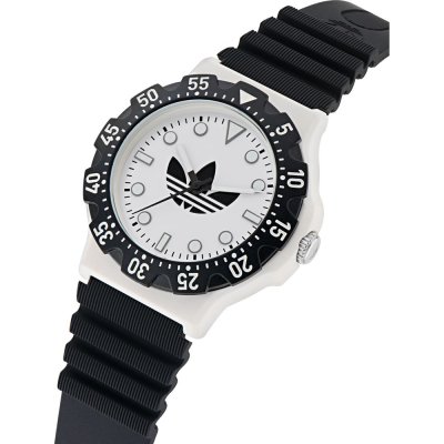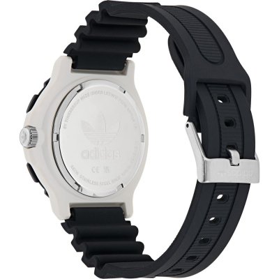 Questo orologio Adidas ha una cassa in Resina con un diametro di 40 mm ed è dotato di un cinturino in gomma. All'interno della cassa si trova un movimento di Timex e l'orologio è dotato di un cristallo di Minerale.