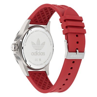 Questo orologio Adidas ha una cassa in Inox con un diametro di 44 mm ed è dotato di un cinturino in gomma. All'interno della cassa si trova un movimento di Timex e l'orologio è dotato di un cristallo di Minerale.