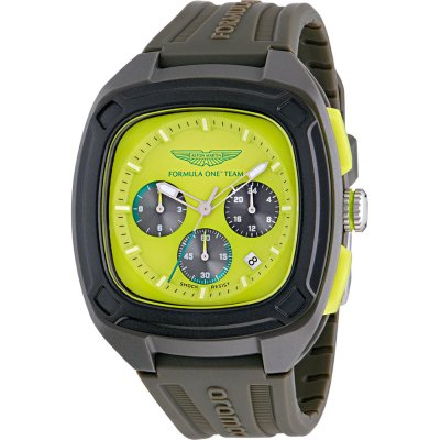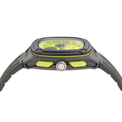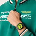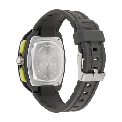 Questo orologio Aston Martin ha una cassa in Resina con un diametro di 44 mm ed è dotato di un cinturino in gomma.