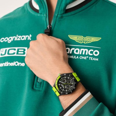 Questo orologio Aston Martin ha una cassa in Resina con un diametro di 46 mm ed è dotato di un cinturino in gomma. All'interno della cassa si trova un movimento di Timex e l'orologio è dotato di un cristallo di Minerale.