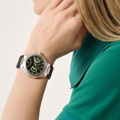 Questo orologio Aston Martin ha una cassa in Inox con un diametro di 42 mm ed è dotato di un cinturino in gomma. All'interno della cassa si trova un movimento di Timex e l'orologio è dotato di un cristallo di Minerale.