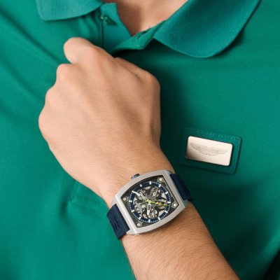 Questo orologio Aston Martin ha una cassa in Titanio con un diametro di 41 mm ed è dotato di un cinturino in gomma. All'interno della cassa si trova un movimento di Timex e l'orologio è dotato di un cristallo di Minerale.