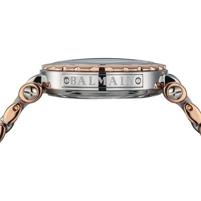 Questo orologio Balmain ha una cassa in Inox con un diametro di 38 mm ed è dotato di un cinturino in Inox. All'interno della cassa si trova un movimento di ETA e l'orologio è dotato di un cristallo di Zaffiro.