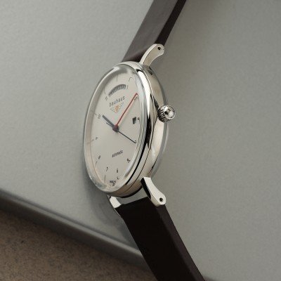 Questo orologio Bauhaus ha una cassa in Inox con un diametro di 41 mm ed è dotato di un cinturino in Pelle. All'interno della cassa si trova un movimento di Miyota e l'orologio è dotato di un cristallo di K1 Minerale.