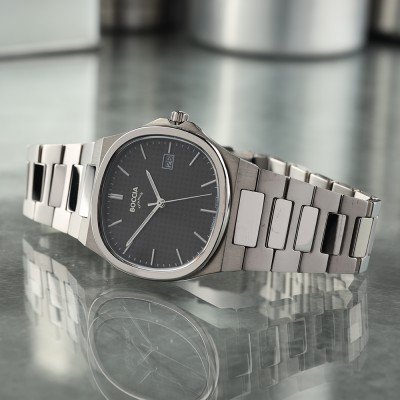 Questo orologio Boccia ha una cassa in Titanio con un diametro di 36 mm ed è dotato di un cinturino in Titanio. All'interno della cassa si trova un movimento di Miyota e l'orologio è dotato di un cristallo di Minerale.