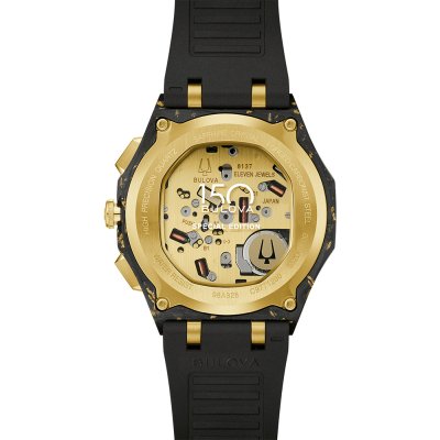 Questo orologio Bulova ha una cassa in Resina rinforzata con carbonio con un diametro di 44 mm ed è dotato di un cinturino in gomma. All'interno della cassa si trova un movimento di Bulova e l'orologio è dotato di un cristallo di Zaffiro singolo antiriflesso.