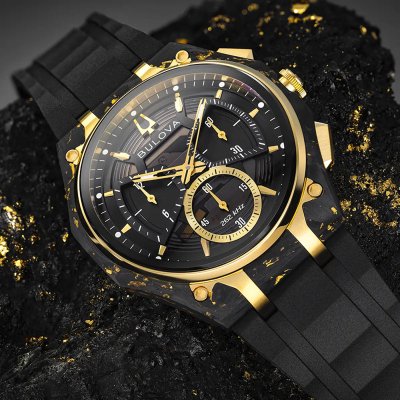 Il Bulova Curv è una meraviglia dell'ingegneria tecnica con un design elegante ed ergonomico e una cassa sottile mai vista prima in un orologio cronografo. Bulova stravolge le regole con il primo movimento cronografo curvo al mondo. Tutti i segnatempo Curv sono alimentati da un movimento al quarzo proprietario ad alta precisione con frequenza di 262 kHz che offre una straordinaria precisione. Ecco il nostro Curv 2025. Nuovo design e nuovi materiali innovativi convergono per creare questa straordinaria cassa. Il carbonio forgiato è combinato con una lamina d'oro pura al 97,97% per ospitare il nostro movimento Curv. La struttura della cassa mette in risalto il nuovo design del quadrante ed è impreziosita da un cinturino in caucciù HNBR di prima qualità e da una fibbia pieghevole che garantisce un comodo appoggio al polso.