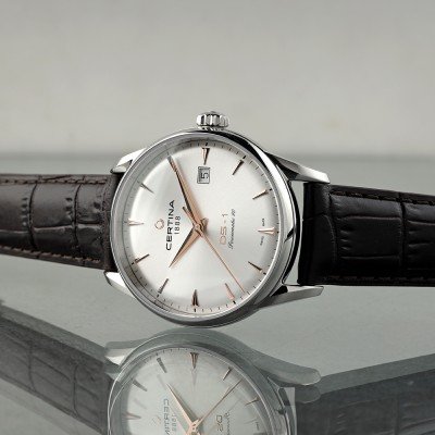 Questo orologio Certina ha una cassa in Inox con un diametro di 40 mm ed è dotato di un cinturino in Pelle. All'interno della cassa si trova un movimento di ETA e l'orologio è dotato di un cristallo di Zaffiro.