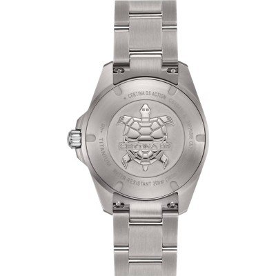 Questo orologio Certina ha una cassa in Titanio con un diametro di 40 mm ed è dotato di un cinturino in Titanio. All'interno della cassa si trova un movimento di ETA e l'orologio è dotato di un cristallo di Zaffiro singolo antiriflesso.