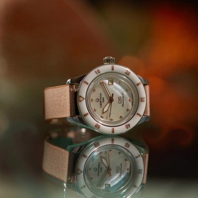 Gli orologi DS PH si ispirano ai leggendari orologi subacquei Certina degli anni Sessanta. L'orologio è dotato di un movimento Powermatic 80 con una notevole riserva di carica di 80 ore. Questa versione da 39 mm piacerà alle signore sportive grazie al suo elegante e morbido cinturino di sicurezza e al quadrante in madreperla con 11 indici di diamanti circondati da una lunetta in ceramica bianca. Progettato per le signore che cercano un orologio elegante e robusto al tempo stesso, questo orologio si distingue per il suo design meticoloso e la sua tecnologia collaudata.