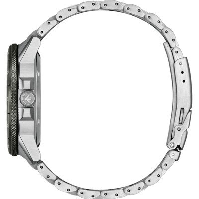 Questo orologio Citizen ha una cassa in Inox con un diametro di 44.5 mm ed è dotato di un cinturino in Inox. All'interno della cassa si trova un movimento di Citizen e l'orologio è dotato di un cristallo di Zaffiro.