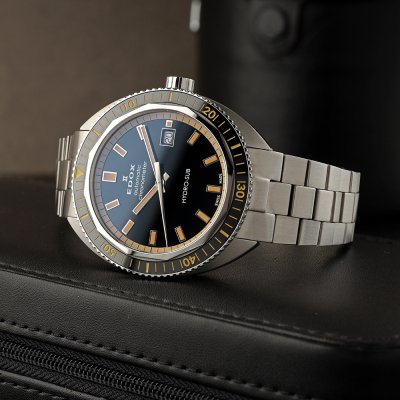Questo Edox Hydro-Sub è un'edizione speciale limitata a soli 500 esemplari. È impermeabile fino a 30 ATM e alimentato da un movimento automatico Edox Calibro 806 basato sul Sellita SW200 e certificato COSC. Il suo design classico è esaltato dal sottile inserto della lunetta in ceramica e dalle lancette e dagli indici luminosi.