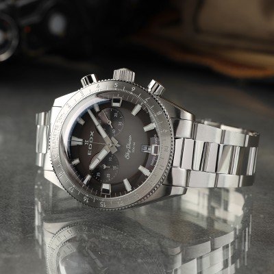 L'Edox Skydiver, limitato a 1000 esemplari in tutto il mondo, è un cronografo moderno che unisce la funzionalità a un'estetica sportiva. L'orologio ha una cassa in acciaio inossidabile, che attira l'attenzione grazie alla superficie opaca/lucida, alla lunetta sottilmente seghettata e al vetro zaffiro bombato. Con un'impermeabilità di 30 ATM, lo Skydiver si sente a suo agio sulla terra, in aria e sott'acqua. Grazie al cinturino in pelle fornito con l'orologio, è possibile passare da un look casual a uno più elegante.
