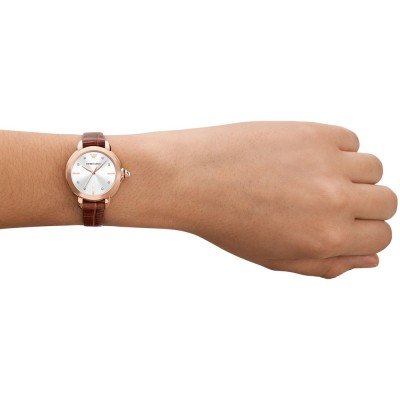 Questo orologio Emporio Armani ha una cassa in Inox con un diametro di 32 mm ed è dotato di un cinturino in Pelle. All'interno della cassa si trova un movimento di Miyota e l'orologio è dotato di un cristallo di Minerale.