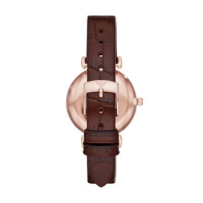 Questo orologio Emporio Armani ha una cassa in Inox con un diametro di 32 mm ed è dotato di un cinturino in Pelle. All'interno della cassa si trova un movimento di Miyota e l'orologio è dotato di un cristallo di Minerale.