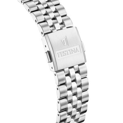 Questo orologio Festina ha una cassa in Inox con un diametro di 41 mm ed è dotato di un cinturino in Inox. All'interno della cassa si trova un movimento di Soprod e l'orologio è dotato di un cristallo di Zaffiro.