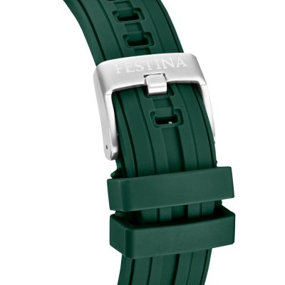 Questo orologio Festina ha una cassa in Inox con un diametro di 46 mm ed è dotato di un cinturino in gomma. All'interno della cassa si trova un movimento di Miyota e l'orologio è dotato di un cristallo di Minerale.