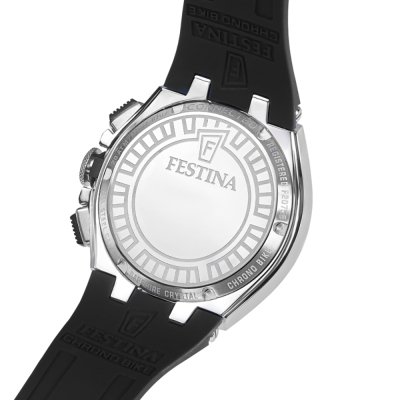 Questo orologio Festina ha una cassa in Inox con un diametro di 46 mm ed è dotato di un cinturino in gomma. All'interno della cassa si trova un movimento di Miyota e l'orologio è dotato di un cristallo di Minerale.