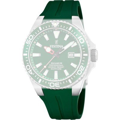 Questo cinturino Festina è fatto in silicone ed è collegato all'orologio per mezzo di perni a molla. Il cinturino ha una larghezza di 26 mm e si chiude a mezzo di fibbia. Il cinturino non ha montatura dritta, il che significa che questo cinturino è adatto solo per gli orologi elencati di seguito.
