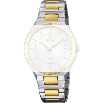 Questo cinturino Festina è fatto in acciaio inox ed è collegato all'orologio per mezzo di perni a molla. Il cinturino ha una larghezza di 20 mm e si chiude a mezzo di chiusura deployante con bottoni. Il cinturino non ha montatura dritta, il che significa che questo cinturino è adatto solo per gli orologi elencati di seguito.