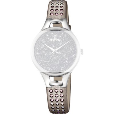 Questo cinturino Festina è fatto in pelle ed è collegato all'orologio per mezzo di perni a molla. Il cinturino ha una larghezza di 12 mm e si chiude a mezzo di fibbia. Il cinturino non ha montatura dritta, il che significa che questo cinturino è adatto solo per gli orologi elencati di seguito.