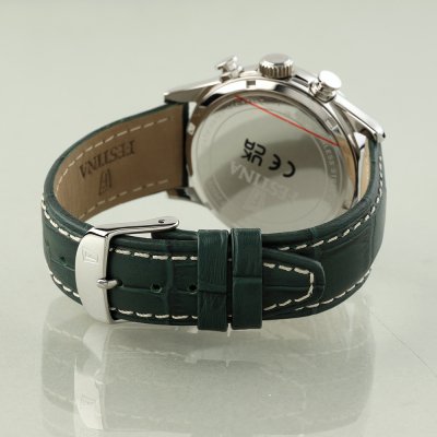 Questo orologio Festina ha una cassa in Inox con un diametro di 43 mm ed è dotato di un cinturino in Pelle. All'interno della cassa si trova un movimento di Miyota e l'orologio è dotato di un cristallo di Minerale.