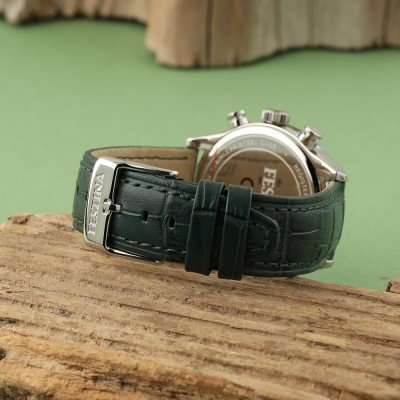 Questo orologio Festina ha una cassa in Inox con un diametro di 43 mm ed è dotato di un cinturino in Pelle. All'interno della cassa si trova un movimento di Miyota e l'orologio è dotato di un cristallo di Minerale.