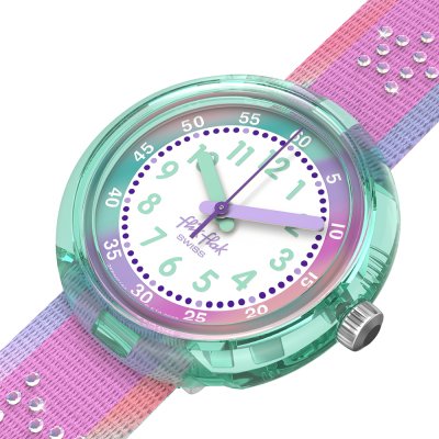 Questo orologio Flik Flak ha una cassa in Plastica di origine biologica con un diametro di 30 mm ed è dotato di un cinturino in Tessuto. All'interno della cassa si trova un movimento di ETA e l'orologio è dotato di un cristallo di Acrilico.