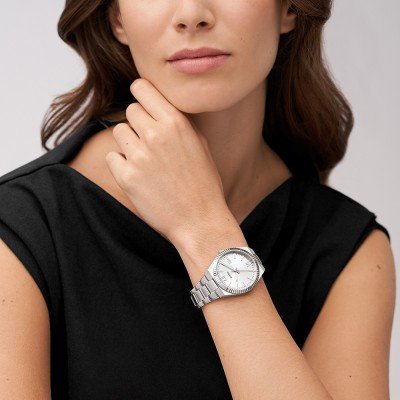 Questo orologio Fossil ha una cassa in Inox con un diametro di 38 mm ed è dotato di un cinturino in Inox. All'interno della cassa si trova un movimento di Miyota e l'orologio è dotato di un cristallo di Minerale.
