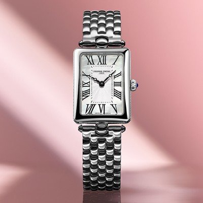 Il Classics Art Déco Carrée trasuda raffinatezza. La cassa rettangolare, tipica degli orologi Art Déco, presenta un bordo scanalato, completato da una corona cabochon altrettanto scanalata, con una pietra blu incastonata. L'elegante quadrante ha un bordo esterno in madreperla con un inserto metallico a ragnatela guilloché, numeri romani e lancette Breguet. Un bracciale in acciaio inossidabile a grana di riso lucido completa il look, che è lussuoso e una combinazione equilibrata di materiali moderni ed estetica vintage che celebra la femminilità.