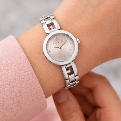 Questo orologio Furla ha una cassa in Inox con un diametro di 24 mm ed è dotato di un cinturino in Inox. All'interno della cassa si trova un movimento di Miyota e l'orologio è dotato di un cristallo di Minerale.