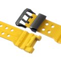 Questo cinturino G-Shock è fatto in gomma ed è collegato all'orologio per mezzo di vite della sella. Il cinturino ha una larghezza di 28 mm e si chiude a mezzo di fibbia. Il cinturino non ha montatura dritta, il che significa che questo cinturino è adatto solo per gli orologi elencati di seguito.