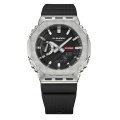 Questo orologio G-Shock ha una cassa in Acciaio inossidabile e plastica con un diametro di 44.4 mm ed è dotato di un cinturino in Plastica di origine biologica. All'interno della cassa si trova un movimento di Casio e l'orologio è dotato di un cristallo di Minerale.