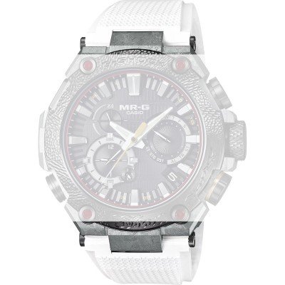 Questo cinturino G-Shock è fatto in gomma ed è collegato all'orologio per mezzo di vite della sella. Il cinturino ha una larghezza di 26.8 mm. Il cinturino non ha montatura dritta, il che significa che questo cinturino è adatto solo per gli orologi elencati di seguito.