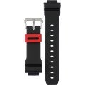 Questo cinturino G-Shock è fatto in resina ed è collegato all'orologio per mezzo di perni a molla. Il cinturino ha una larghezza di 26 mm e si chiude a mezzo di fibbia. Il cinturino non ha montatura dritta, il che significa che questo cinturino è adatto solo per gli orologi elencati di seguito.