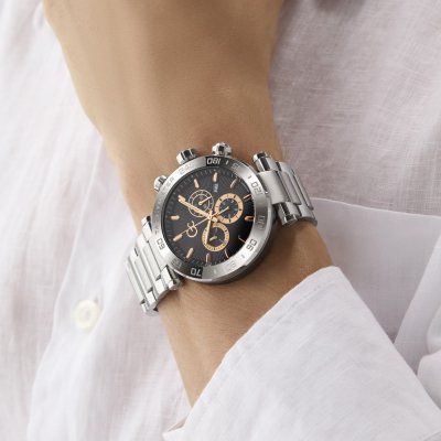 Questo orologio GC ha una cassa in Inox con un diametro di 44 mm ed è dotato di un cinturino in Inox. All'interno della cassa si trova un movimento di Ronda e l'orologio è dotato di un cristallo di Zaffiro.