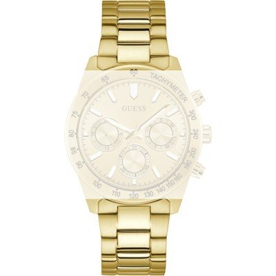 Questo cinturino Guess è fatto in acciaio inox ed è collegato all'orologio per mezzo di perni a molla. Il cinturino ha una larghezza di 21 mm e si chiude a mezzo di chiusura deployante con bottoni. Il cinturino non ha montatura dritta, il che significa che questo cinturino è adatto solo per gli orologi elencati di seguito.