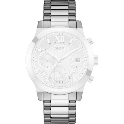 Questo cinturino Guess è fatto in acciaio inox ed è collegato all'orologio per mezzo di perni a molla. Il cinturino ha una larghezza di 22 mm e si chiude a mezzo di chiusura deployante con bottoni. Il cinturino non ha montatura dritta, il che significa che questo cinturino è adatto solo per gli orologi elencati di seguito.