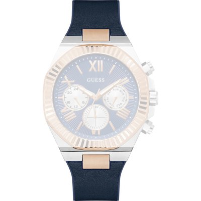 Questo cinturino Guess è fatto in silicone ed è collegato all'orologio per mezzo di perni in acciaio. Il cinturino ha una larghezza di 24 mm e si chiude a mezzo di fibbia. Il cinturino non ha montatura dritta, il che significa che questo cinturino è adatto solo per gli orologi elencati di seguito.