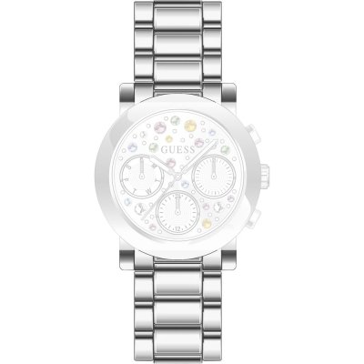 Questo cinturino Guess è fatto in metallo ed è collegato all'orologio per mezzo di perni a molla. Il cinturino ha una larghezza di 20 mm e si chiude a mezzo di chiusura deployante con bottoni. Il cinturino non ha montatura dritta, il che significa che questo cinturino è adatto solo per gli orologi elencati di seguito.