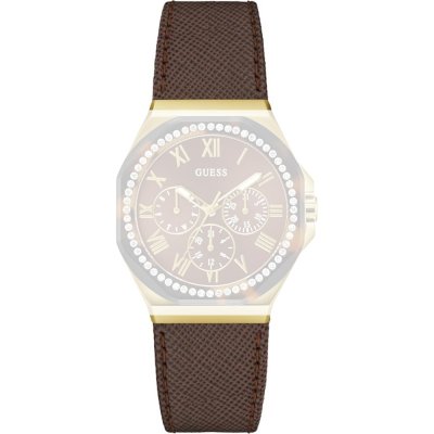 Questo cinturino Guess è fatto in pelle ed è collegato all'orologio per mezzo di perni in acciaio. Il cinturino ha una larghezza di 22 mm e si chiude a mezzo di fibbia. Il cinturino non ha montatura dritta, il che significa che questo cinturino è adatto solo per gli orologi elencati di seguito.