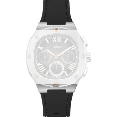 Questo cinturino Guess è fatto in silicone ed è collegato all'orologio per mezzo di perni in acciaio. Il cinturino ha una larghezza di 25 mm e si chiude a mezzo di fibbia. Il cinturino non ha montatura dritta, il che significa che questo cinturino è adatto solo per gli orologi elencati di seguito.
