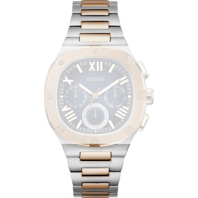 Questo cinturino Guess è fatto in acciaio inox ed è collegato all'orologio per mezzo di perni in acciaio. Il cinturino ha una larghezza di 25 mm e si chiude a mezzo di chiusura deployante con bottoni. Il cinturino non ha montatura dritta, il che significa che questo cinturino è adatto solo per gli orologi elencati di seguito.