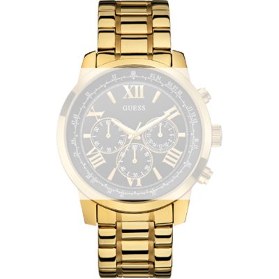 Questo cinturino Guess è fatto in acciaio inox ed è collegato all'orologio per mezzo di perni a molla. Il cinturino ha una larghezza di 22 mm e si chiude a mezzo di chiusura deployante con bottoni. Il cinturino non ha montatura dritta, il che significa che questo cinturino è adatto solo per gli orologi elencati di seguito.