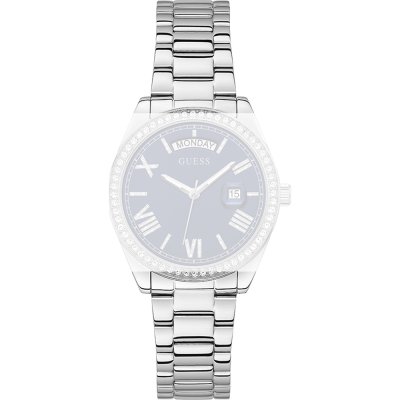 Questo cinturino Guess è fatto in acciaio inox ed è collegato all'orologio per mezzo di perni a molla. Il cinturino ha una larghezza di 18 mm e si chiude a mezzo di chiusura deployante con bottoni. Il cinturino non ha montatura dritta, il che significa che questo cinturino è adatto solo per gli orologi elencati di seguito.