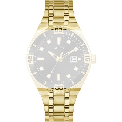 Questo cinturino Guess è fatto in acciaio inox ed è collegato all'orologio per mezzo di perni a molla. Il cinturino ha una larghezza di 20 mm e si chiude a mezzo di chiusura deployante con bottoni. Il cinturino non ha montatura dritta, il che significa che questo cinturino è adatto solo per gli orologi elencati di seguito.