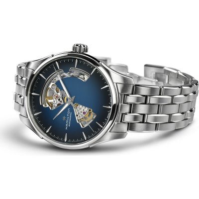 Una delle linee di orologi più distinte di Hamilton, il Jazzmaster è forse la più caratterizzata in termini di eleganza e raffinatezza, con finiture e design che tendono all'alto di gamma. Il modello "Open Heart" è caratterizzato da un quadrante ritagliato, che rivela le aree chiave del movimento sottostante. In questo modo la leggibilità dell'orologio rimane in gran parte intatta, ma conferisce anche all'orologio il suo aspetto caratteristico. Sono esposti alcuni rubini dell'orologio, il treno di ingranaggi, il cricchetto e il bilanciere. Il quadrante è a raggiera con indici a losanga applicati e lancette Dauphine, sotto un vetro zaffiro. Il movimento H-10 è l'affidabile cavallo di battaglia di Hamilton, con spirale Nivachron e riserva di carica di 80 ore.