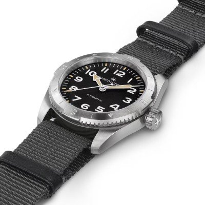 Questo orologio Hamilton ha una cassa in Inox con un diametro di 37 mm ed è dotato di un cinturino in Tessuto. All'interno della cassa si trova un movimento di ETA e l'orologio è dotato di un cristallo di Zaffiro.