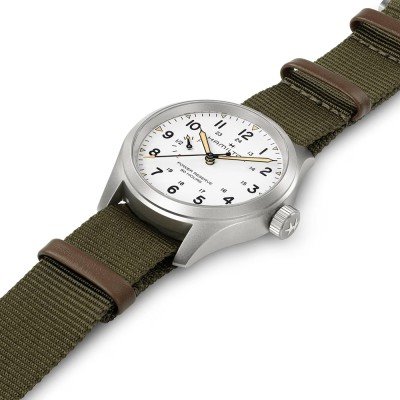 La collezione Hamilton Khaki è stata ampliata con il Khaki Field Mechanical Power Reserve. Si tratta di un orologio da campo militare classico e utilitario, nella tradizione del patrimonio militare di Hamilton dal 1914, noto per la sua robustezza e affidabilità. Oltre a questa tradizione, Hamilton presenta ora il primo Khaki Field con indicatore della riserva di carica sul quadrante. L'orologio è alimentato dal nuovo movimento H-23, sviluppato da ETA in esclusiva per Hamilton, ed è il primo Khaki Field ad avere un'impressionante riserva di carica di 80 ore. Fedele alle sue radici utilitarie, come una jeep dell'esercito, la scala della riserva di carica sul quadrante indica solo "F" per pieno e "E" per vuoto. Il quadrante è inoltre accompagnato da scale militari pulite a 12 e 24 ore, lancette a siringa luminose e indici resi in una calda patina marrone d'epoca, che conferisce all'orologio un aspetto perfettamente amalgamato di orologio militare d'epoca e tecnologia moderna.