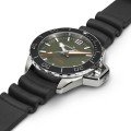 A prima vista, il Khaki Navy Frogman Automatic è un orologio subacqueo abbastanza semplice con un quadrante di facile lettura, lancette robuste e una corona protetta. Ciò che distingue questo orologio è nei dettagli, sia visibili che invisibili. La sorprendente protezione della corona presenta un meccanismo unico che si muove con la corona stessa. In questo modo la protezione è sempre garantita. E l'elegante cinturino in caucciù presenta un motivo a onde adatto alla navigazione che si muove con l'espansione e la contrazione del polso del subacqueo. Inoltre, "sotto il cofano" è nascosto un potente movimento automatico H-10 e l'orologio è impermeabile fino a 30 bar.
